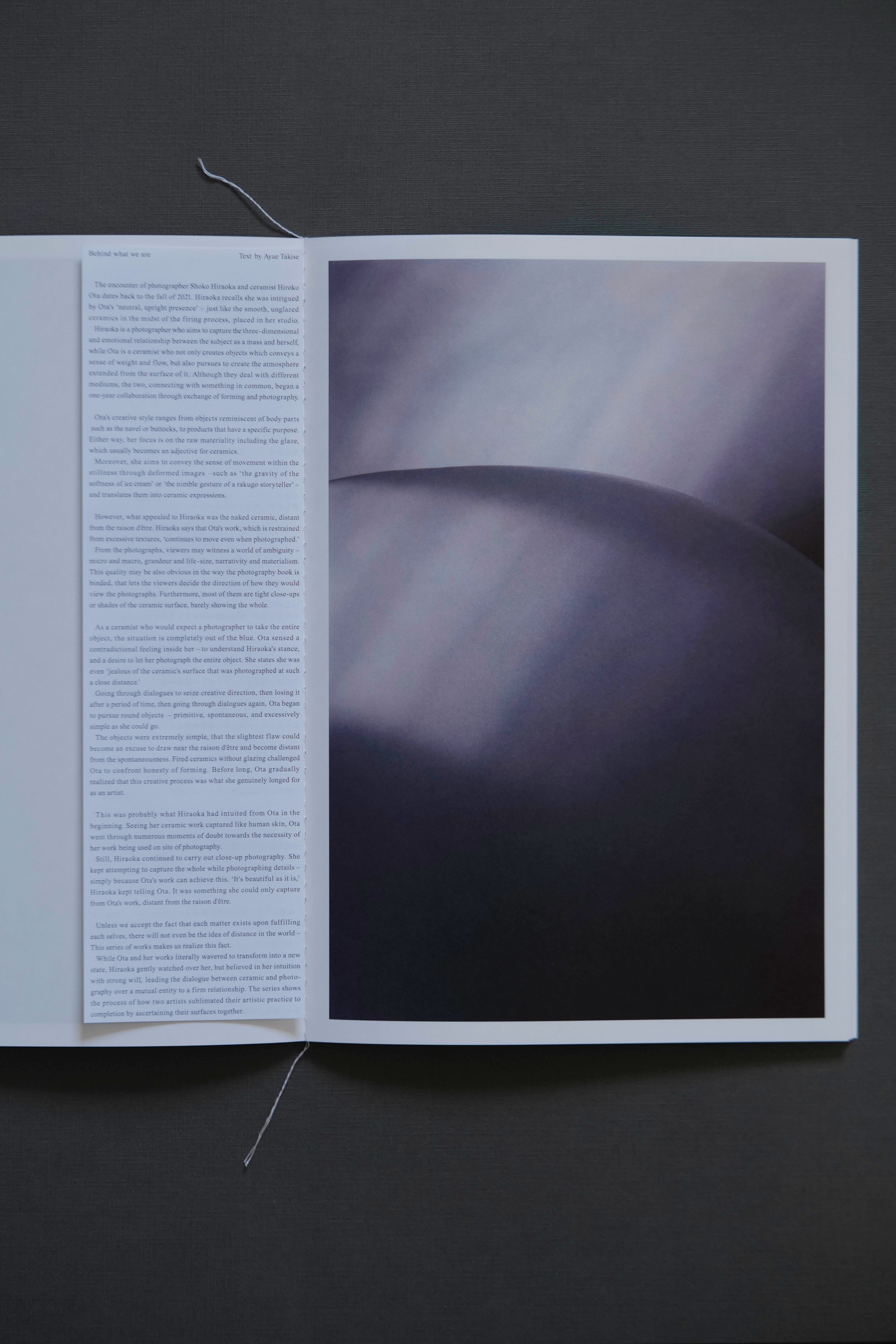 写真家である平岡尚子が、陶作家である太田浩子氏の人肌とも錯覚させるような陶作品を春夏秋冬の太陽光の下、太田氏のアトリエの庭で撮影した写真集。ミクロとマクロを行き来するような、平岡の新たな視点で写真として捉えた作品群が掲載されており、文筆家の瀧瀬彩恵氏による製作過程が綴られた序文も別紙で差し込まれています。